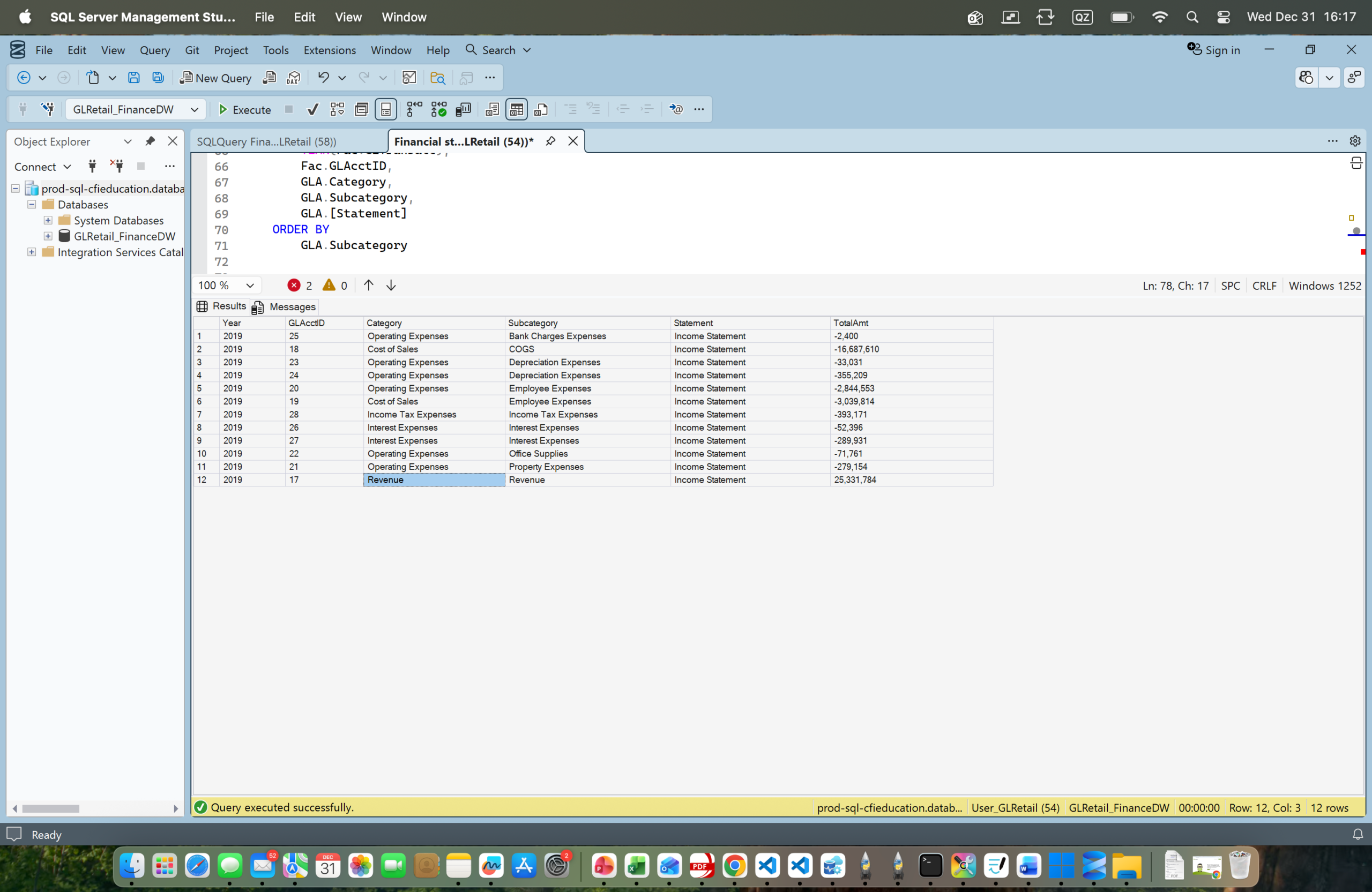 I have used SQL Server Management Studio to query a financial data warehouse, extracting summarized income statement data by year, GL account, category, and subcategory. The query aggregates transaction amounts into a clean, ordered result set that standardizes revenues and expenses, producing a structured income statement table that serves as the source layer for downstream analysis and reporting.https://samad-majidiprojects.website/wp-content/uploads/2025/12/Screenshot-2025-12-31-at-16.17.05-scaled.webp